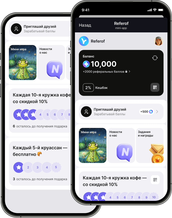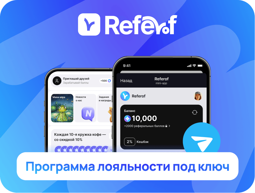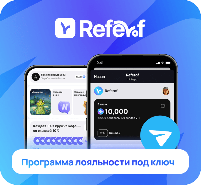 С Referof ваша программа лояльности уже доступна в Telegram Mini App. Клиенту достаточно один раз перейти к вашему боту — и он автоматически получает доступ к приложению, рассылкам и новостям